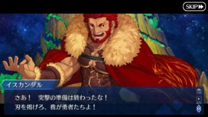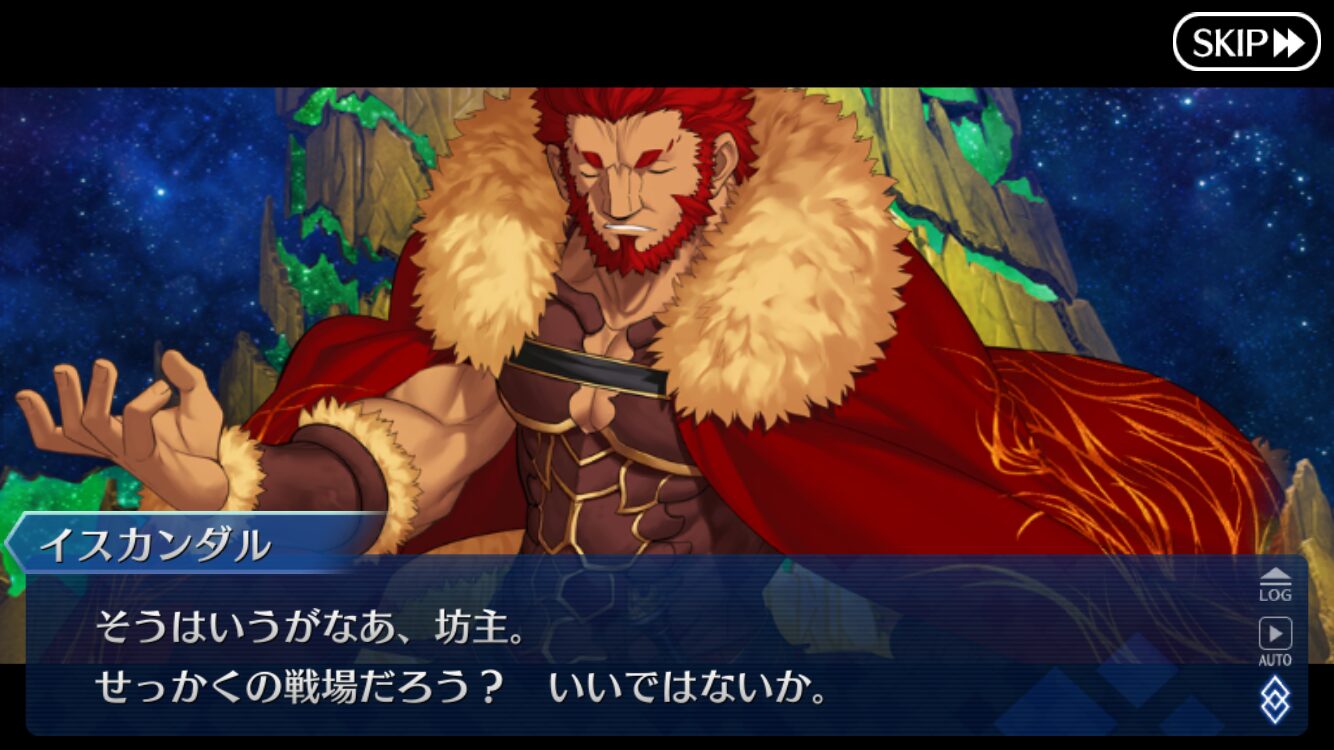 イスカンダルもやる気十分。突撃しようとしたため「おまえもだバカ!」とエルメロイⅡ世に止められます。