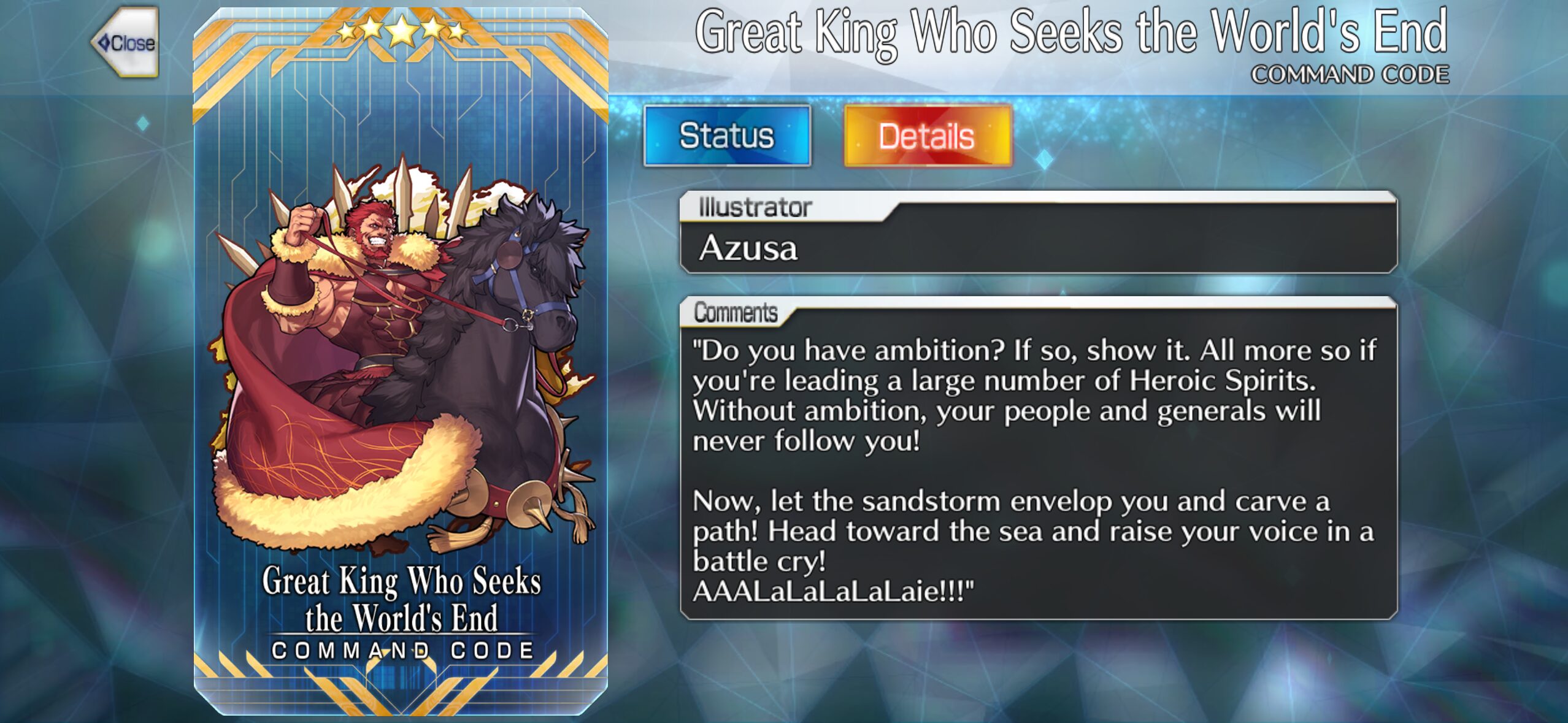 Fate/Grand Orderの諸葛孔明〔エルメロイII世〕関連のコマンドコードまとめ みょこ Fate/Grand Order のサーヴァント「諸葛孔明〔エルメロイII世〕」関連のコマンドコードまとめです。 最終調査日は2025/6/28。No.でいうと197まで。 コマンドコード No.37 心緋き臣下の令印 フレーバーテキスト / カード / カード(文字なし) フレーバーテキスト(北米版) No.38 無形の匣 フレーバーテキスト / カード / カード(文字なし) フレーバーテキスト(北米版) No.152 最果てに臨む大王 フレーバーテキスト / カード / カード(文字なし) フレーバーテキスト(北米版) No.196 征服王の戦車 フレーバーテキスト / カード / カード(文字なし) No.197 書庫の王 フレーバーテキスト / カード / カード(文字なし)